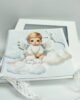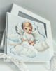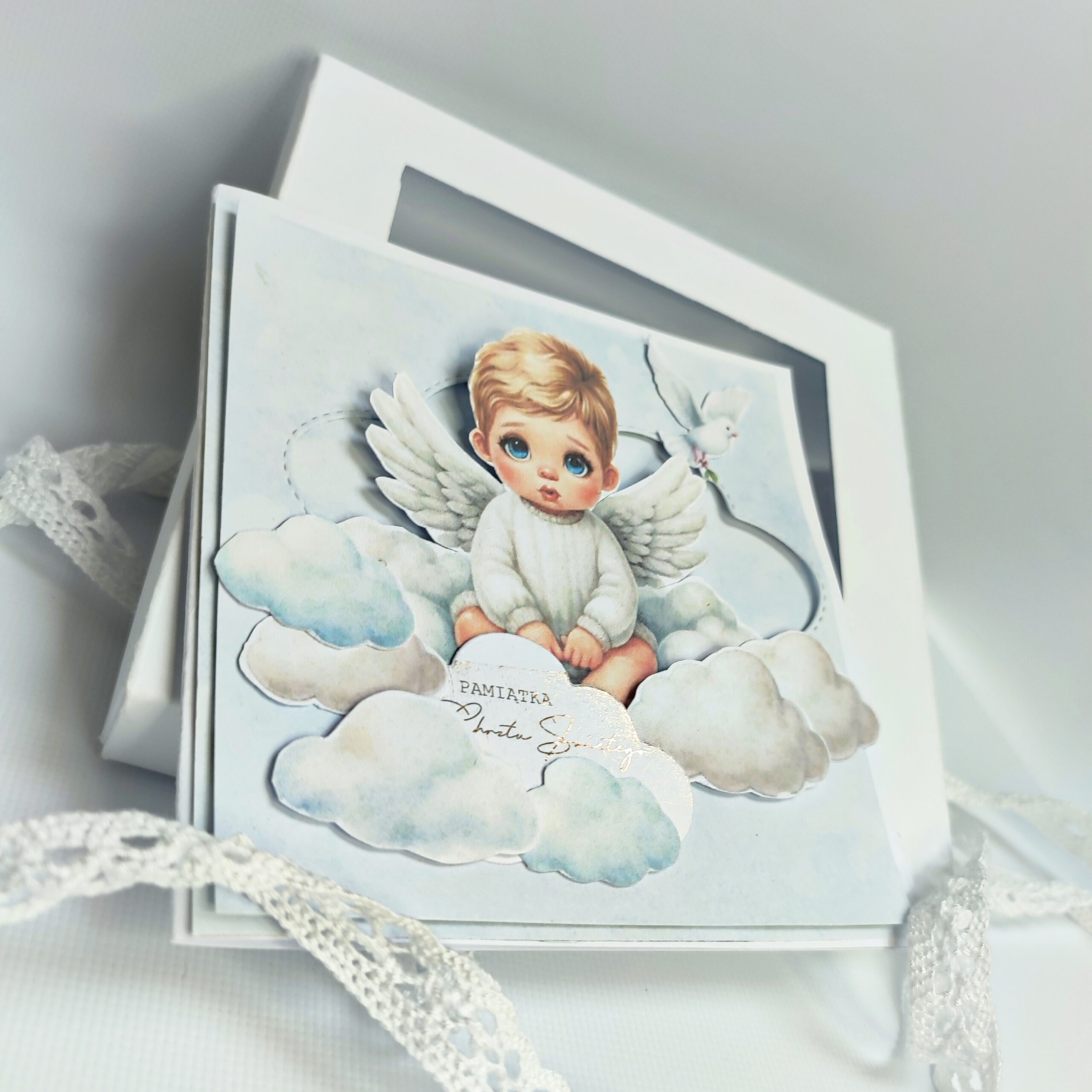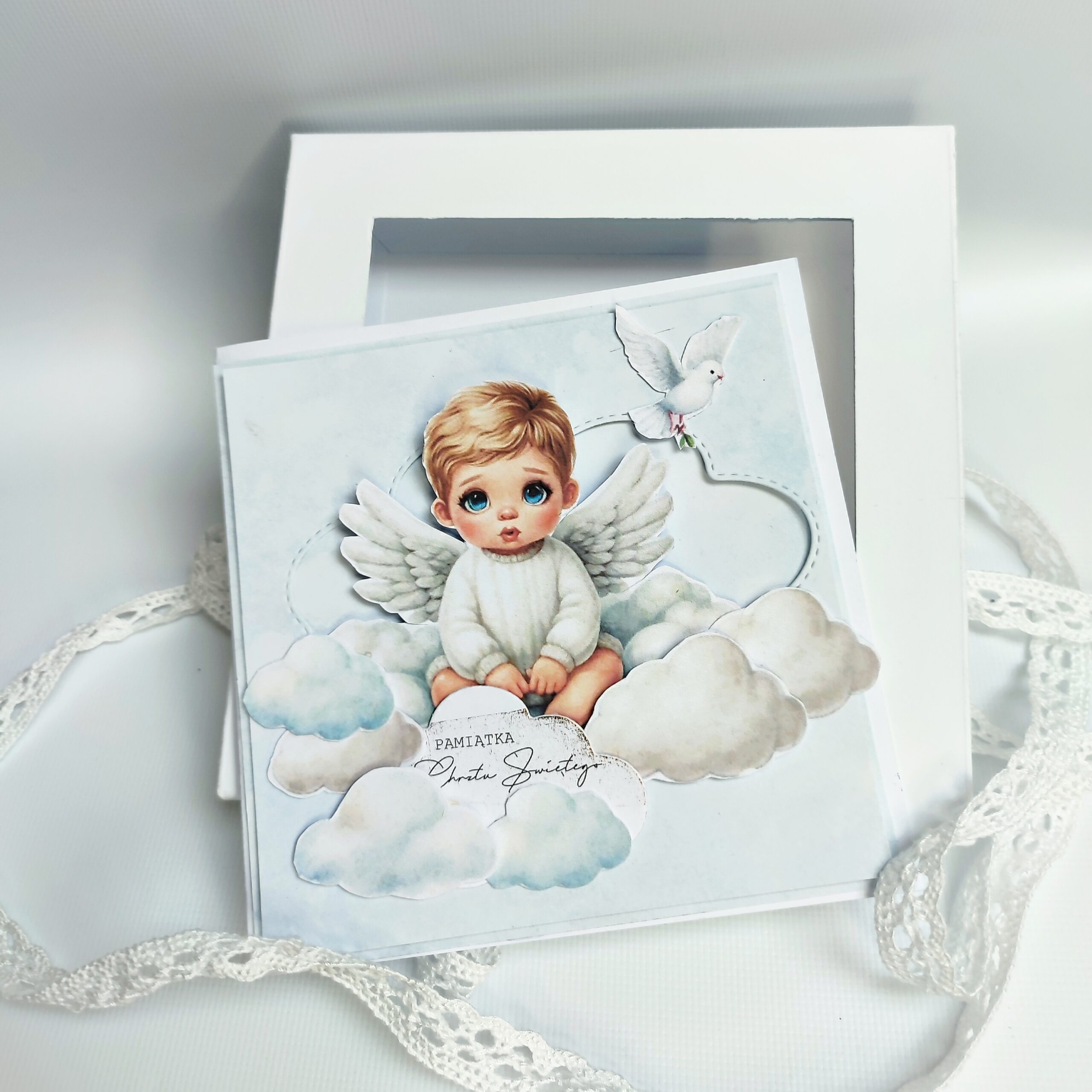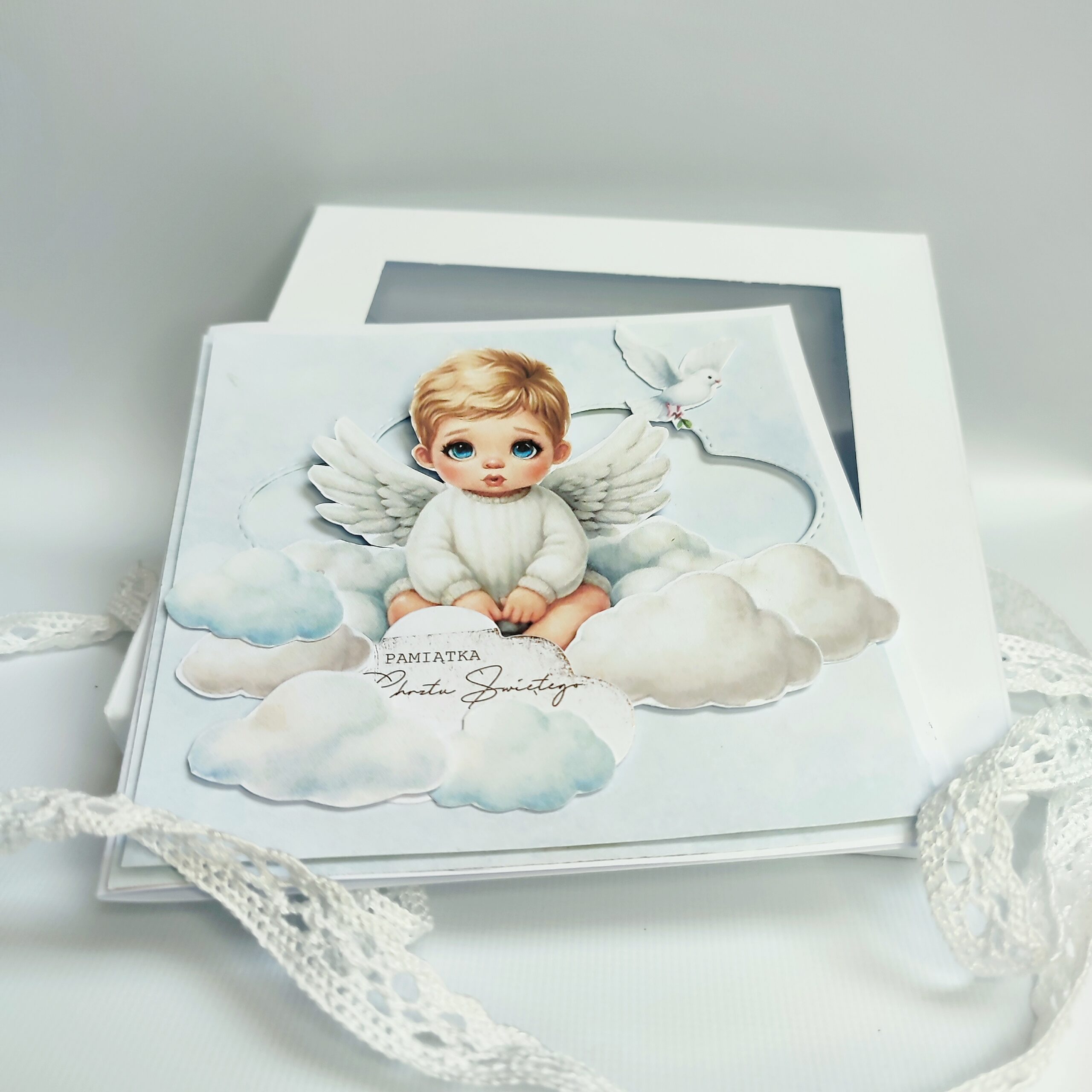 Głównym elementem kompozycji jest uroczy mały aniołek – chłopiec o łagodnym wyrazie twarzy, siedzący pośród miękkich, puszystych chmurek. Chmurki zostały przyklejone warstwowo, co tworzy efekt trójwymiarowości i nadaje kartce przestrzenność. Dzięki temu scena wygląda jak wyjęta z baśni, pełna spokoju i dziecięcej niewinności.