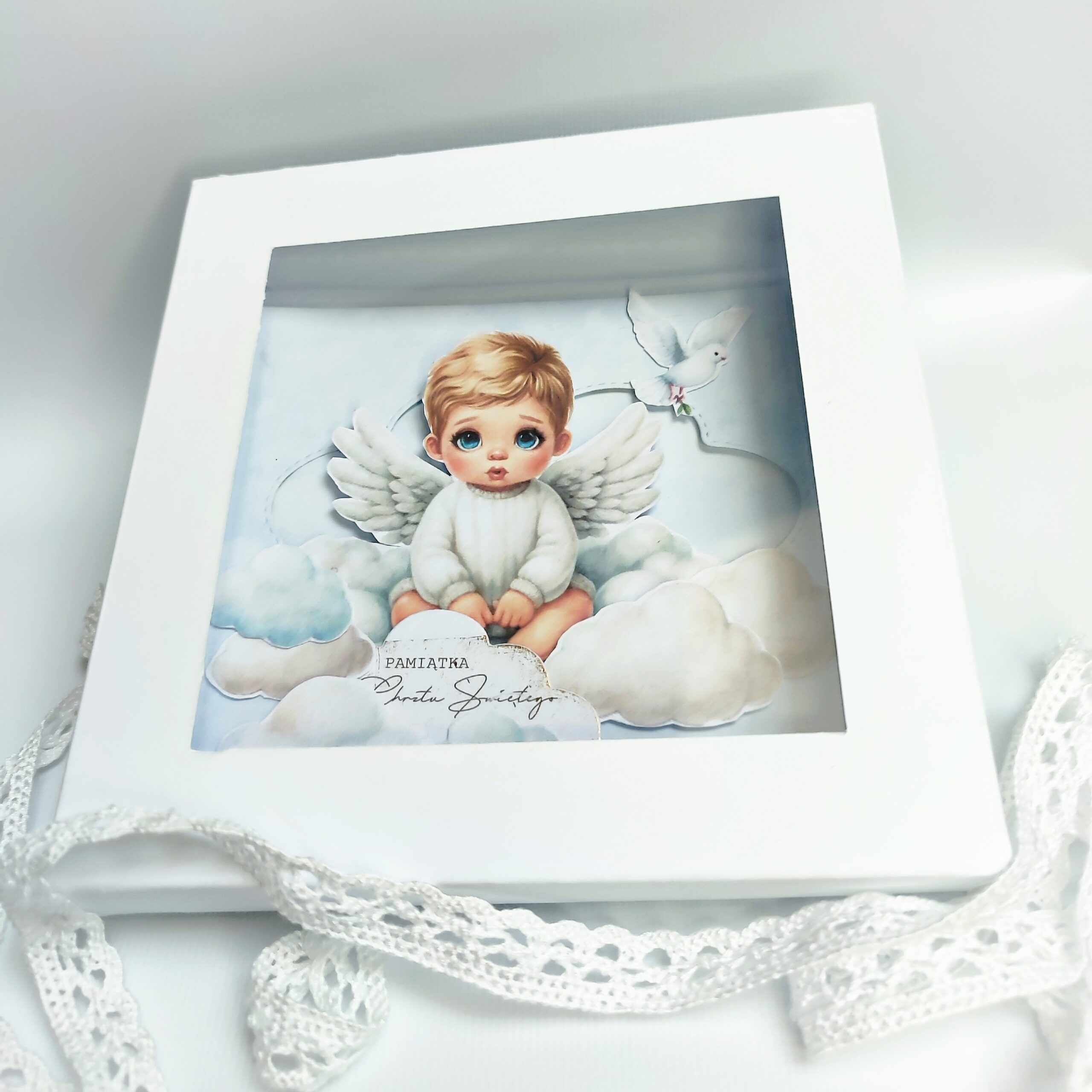 Nad aniołkiem unosi się delikatny biały gołąbek, symbol czystości i błogosławieństwa. Jego skrzydła są subtelnie uniesione, jakby właśnie leciał, przynosząc dobre nowiny.