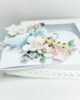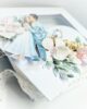 Dookoła pary rozkwitają ręcznie robione kwiaty, wykonane z precyzyjnie uformowanego foamiranu. Ciepłe odcienie różu, błękitu, brzoskwini i ecru dodają całości lekkości i romantyzmu. Delikatne listki i drobne akcenty w pastelowej zieleni subtelnie podkreślają kompozycję.