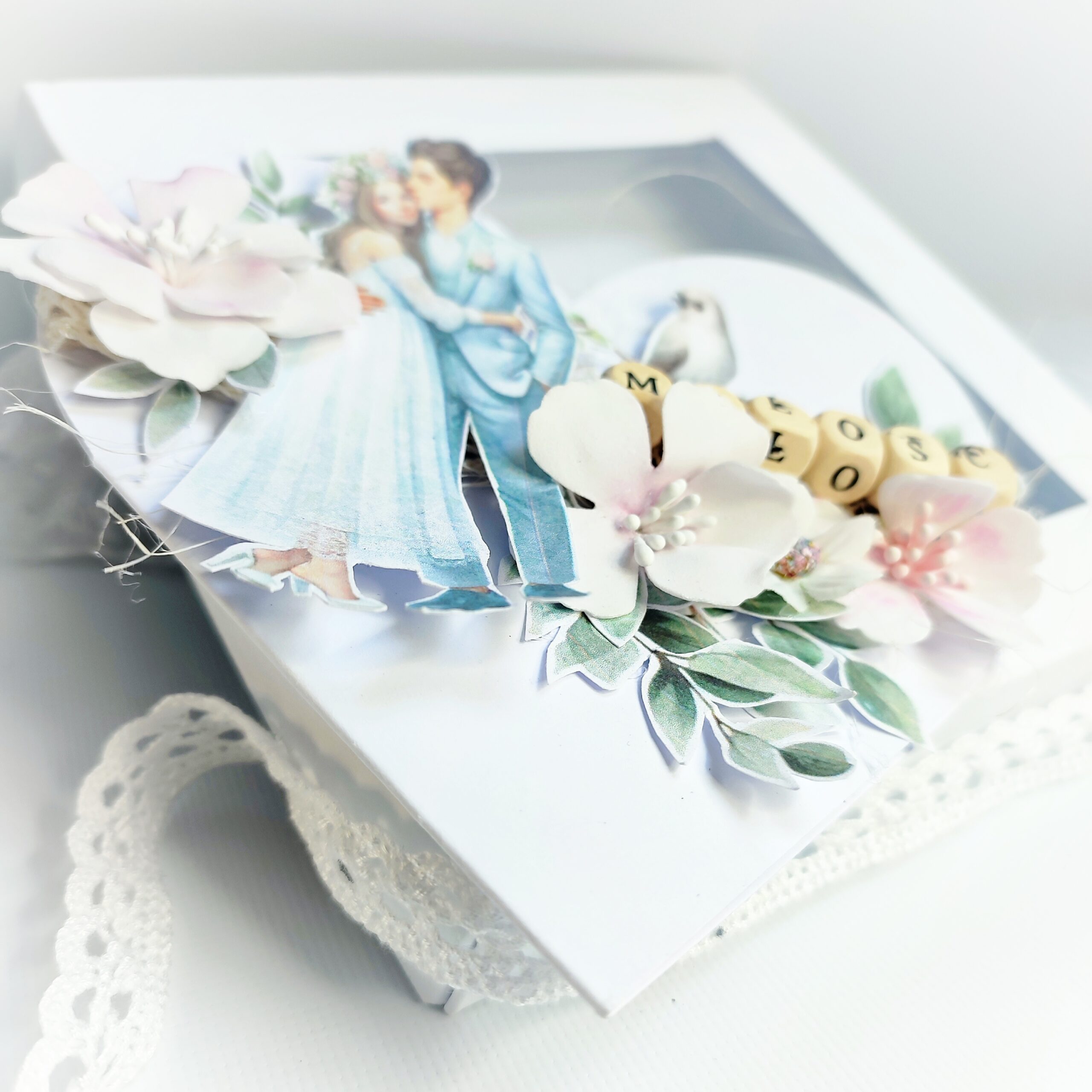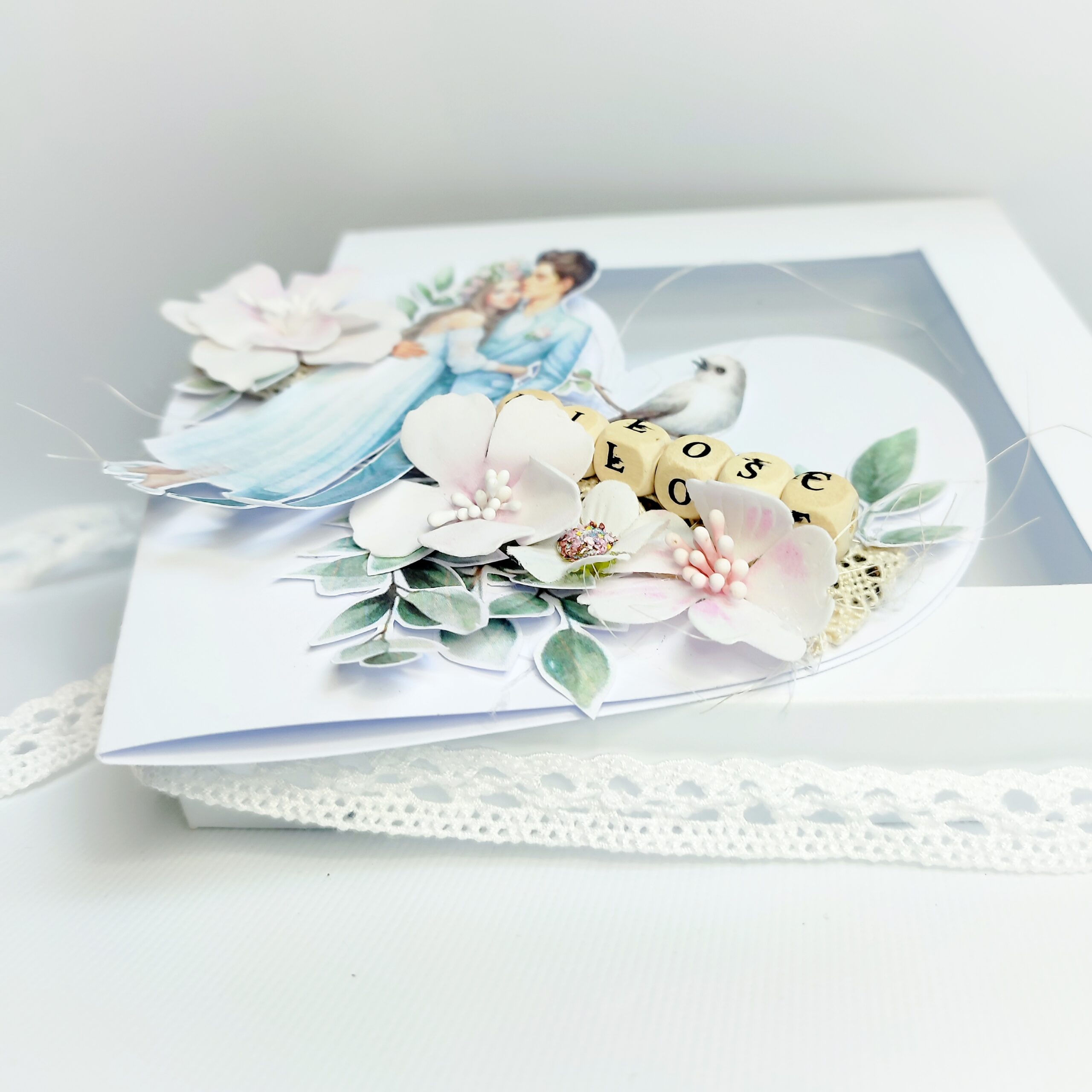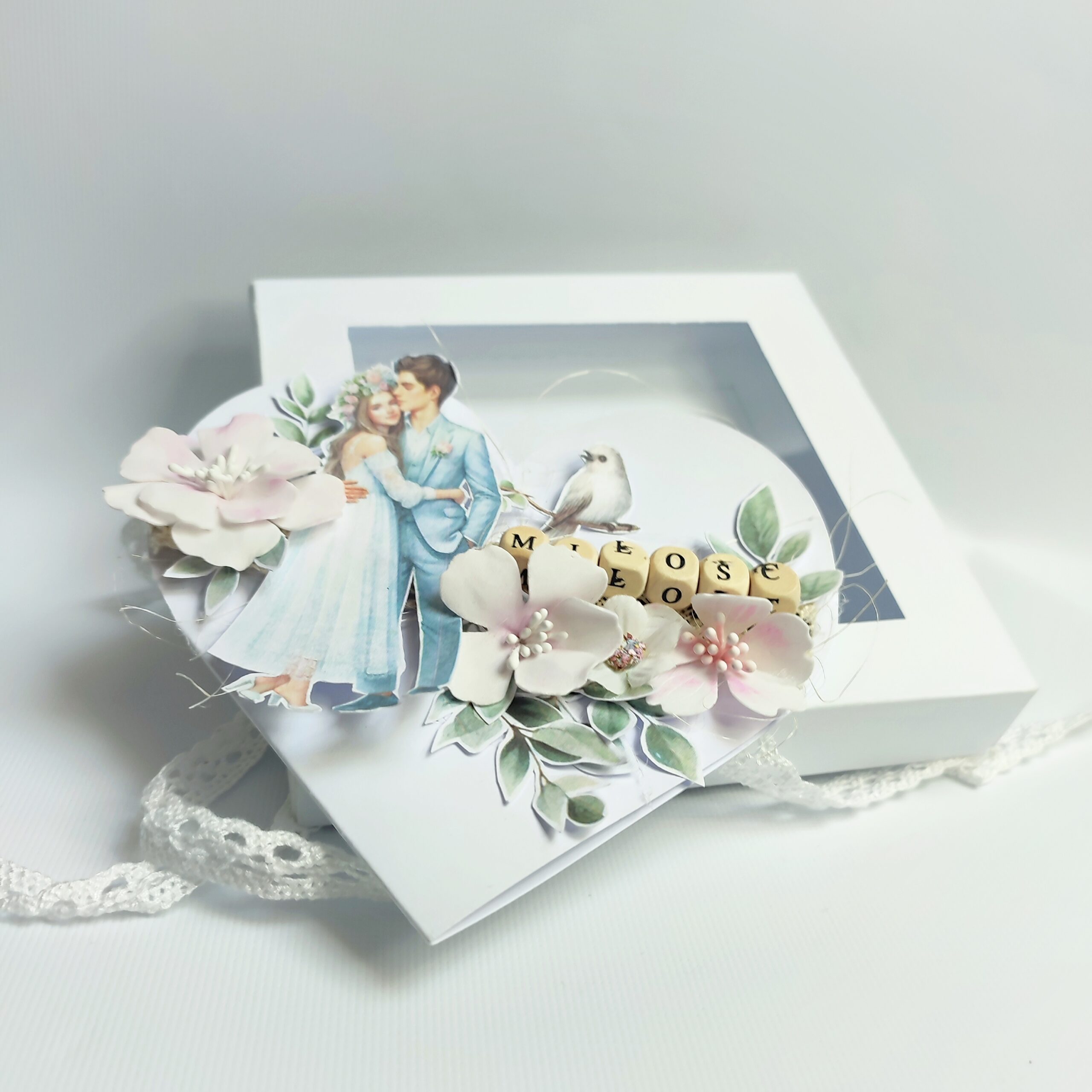 Kartka ręcznie robiona w kształcie serca to wyjątkowy, romantyczny projekt, utrzymany w pastelowych kolorach, które nadają jej delikatności i subtelnej elegancji. Jej głównym elementem jest urocza kompozycja przedstawiająca młodą parę – misternie wycięty wizerunek zakochanych, otoczony starannie dobranymi ozdobami.