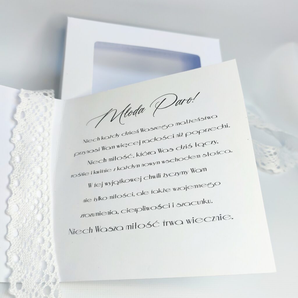 Chcesz dodać własne życzenia lub imiona nowożeńców ? Istnieje możliwość personalizacji kartki! W tym celu skontaktuj się z nami mailowo a przygotujemy kartkę dostosowaną do Twoich potrzeb.
