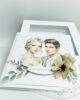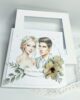 Na froncie kartki znajduje się niezwykle delikatna grafika przedstawiająca elegancką Parę Młodą – uśmiechniętą pannę młodą z romantycznym wiankiem z białych kwiatów we włosach oraz przystojnego pana młodego w klasycznym garniturze. Ich spojrzenia pełne miłości sprawiają, że kartka emanuje ciepłem i wyjątkowym urokiem.