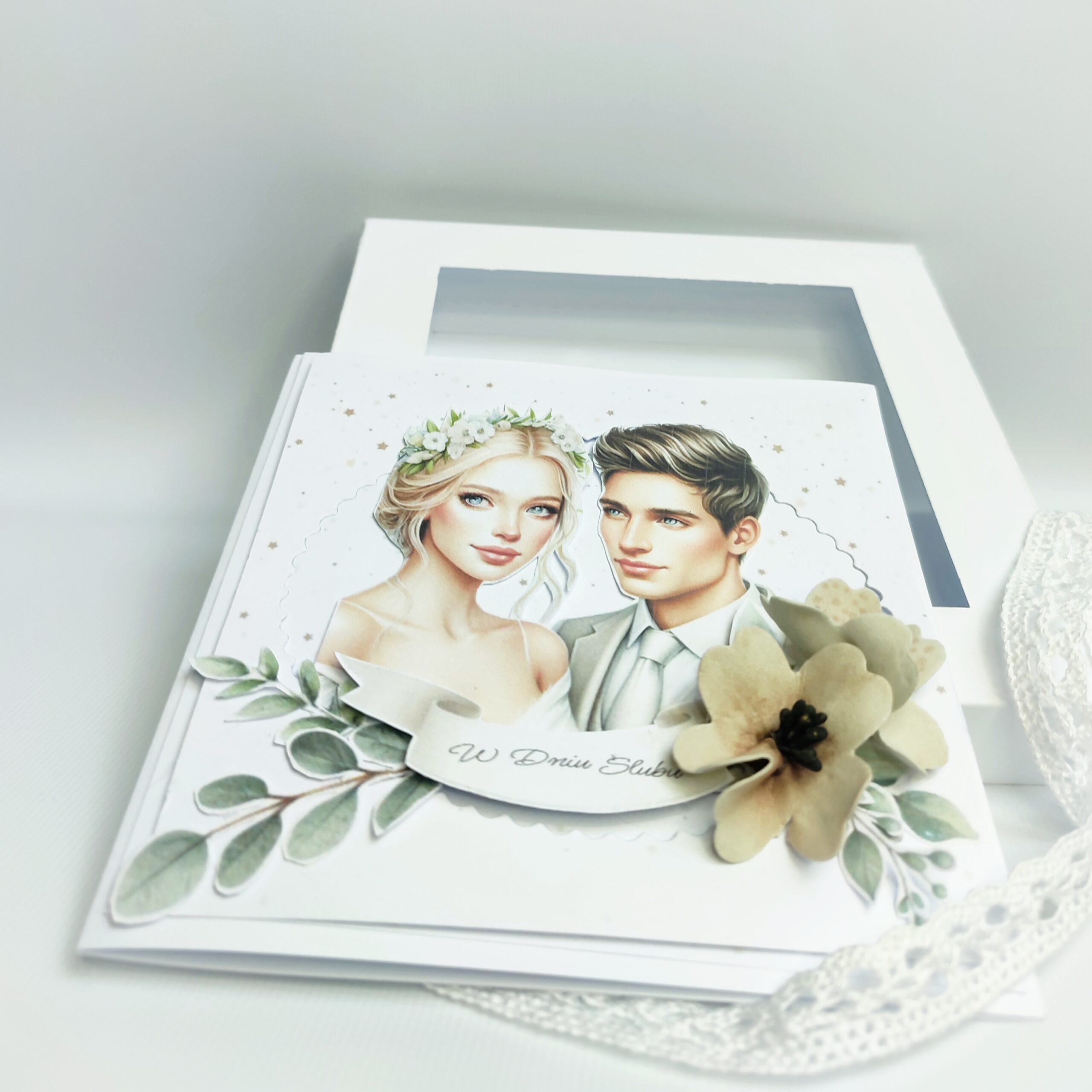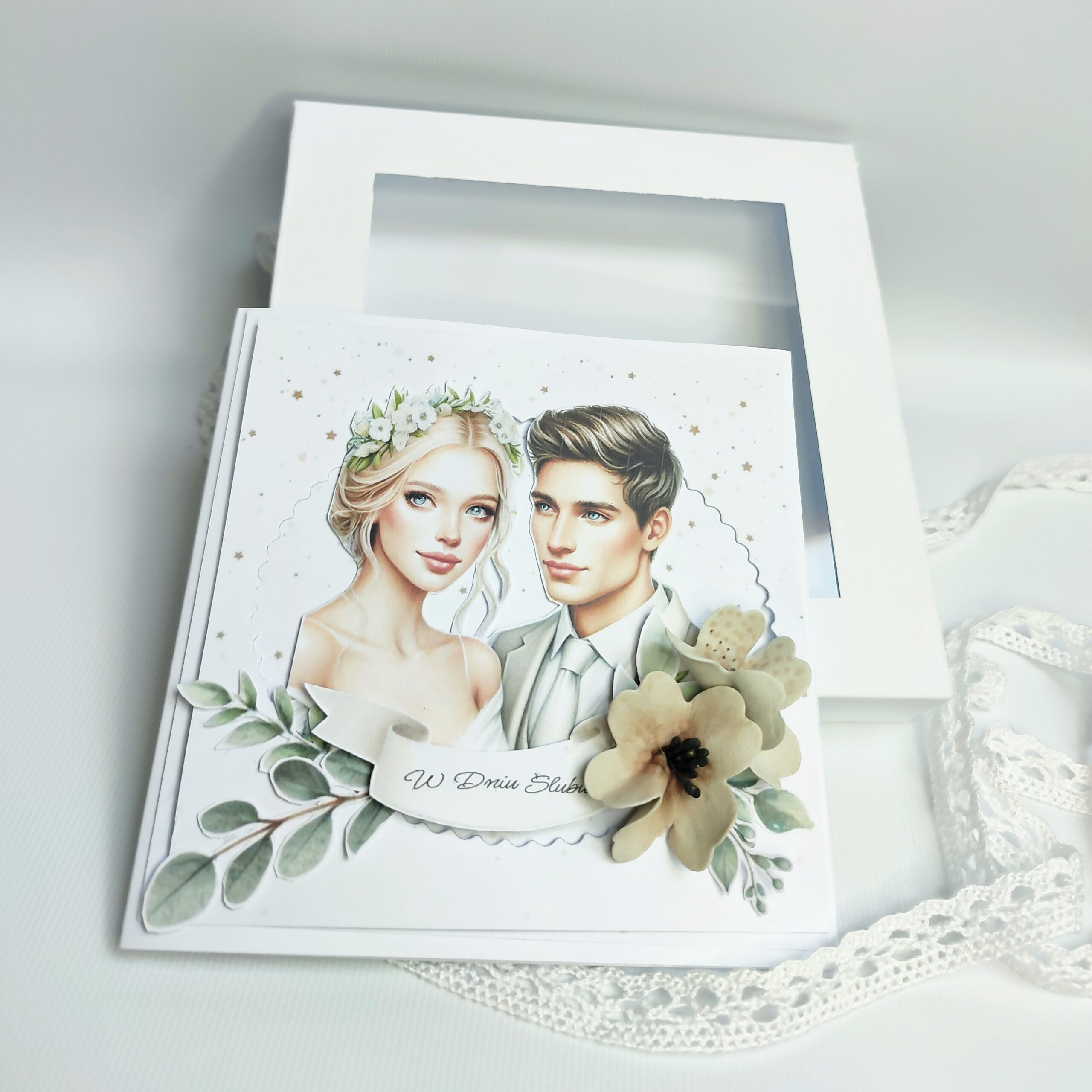 Kartka zapakowana jest w ekskluzywne, białe pudełko z okienkiem, co sprawia, że prezentuje się niezwykle elegancko i jest gotowa do wręczenia.