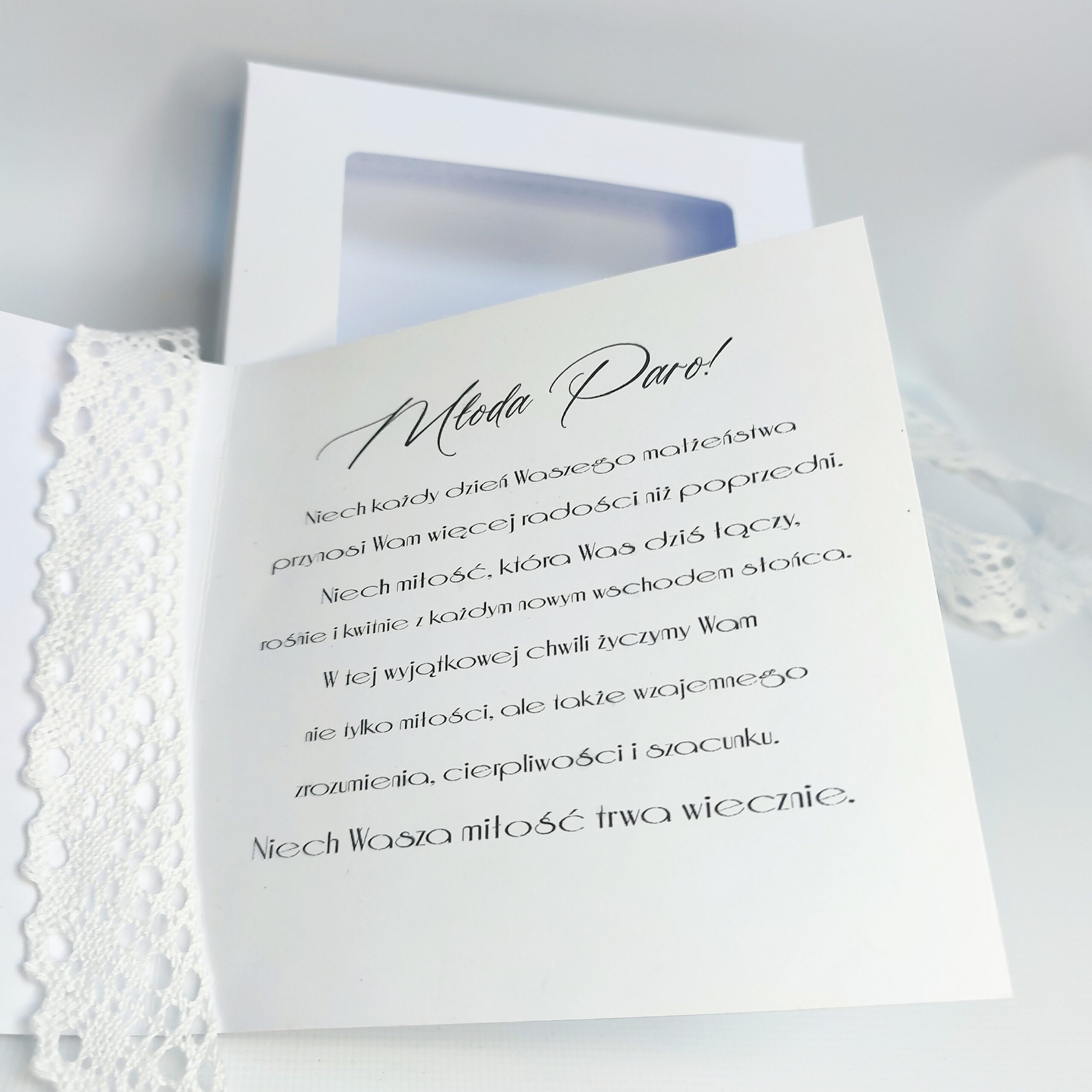 W środku kartki umieszczone są piękne życzenia, gotowe do wręczenia nowożeńcom. Istnieje również możliwość dodania własnego tekstu lub dedykacji, aby uczynić ją jeszcze bardziej osobistą.